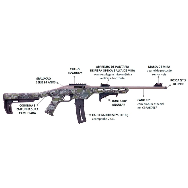 Com alta precisão, baixo estampido e recuo praticamente imperceptível, o Tactical é um rifle semiautomático, com alta velocidade de disparo. Possui coronha tática em polímero enriquecido com fibra de vidro, que garante grande leveza e resistência à arma, desenho do cabo do ferrolho ‘mais robusto’ para facilitar seu manejo. Conta ainda com 2 carregadores de 25 unidades.